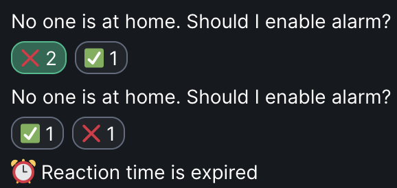 It's an Opsdroid bot, which reacts to a home-assistant entity state change (like person leaving a zone) and asks for confirmation in Matrix if it should run additional home-assistant automation. Matrix reactions are used for confirming or canceling an action.