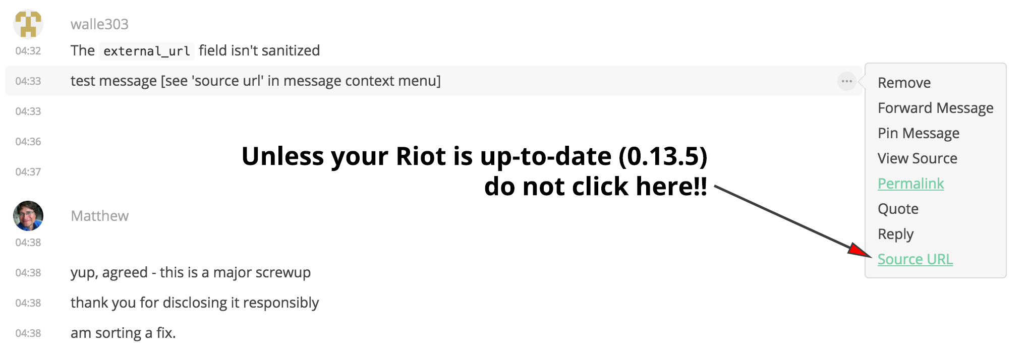If you're not able to upgrade to Riot/Web 0.13.5 for some reason, then please do not click on the 'Source URL' feature on the event context menu: