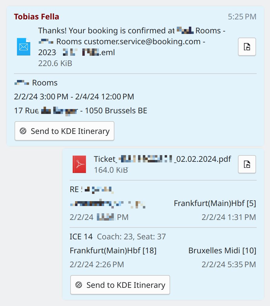 Have you ever thought "man, I sure wish my Matrix client would show me more information about these train tickets and hotel reservations my friend just sent me"? Well, your wait is finally over! If you have KDE Itinerary installed on your system, NeoChat will now use its tooling to extract information from such documents and presents it, together with the ability to directly import it into your Itinerary.